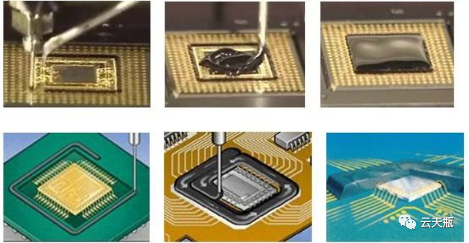 电子制造上常用的胶粘剂有环氧树脂,UV (紫外)胶水,热熔胶,锡膏,厌氧胶,双组胶等。环氧树脂一般通过高温固化,固化后粘接力大, 广泛应用在功能器件的粘接,底部填充 Underfill 等工艺上。在电子制造业中环氧胶的生产厂家有 美国汉高旗下的乐泰,日本富士,华海诚科,回天等。UV胶通过紫外光固化,其污染小固化快, 在一些包封点胶,表面点胶等领域应用最广,目 前 UV 胶制造厂家有汉高乐泰,信友,德邦,华海 诚科,海斯迪克等。芯片封装中固晶胶其对胶水的粘接能力,导热率,热阻等都有要求,在芯片封装 中特别是 LED 芯片封装中,美国道康宁胶水应用 最为广泛,国内华海诚科,回天,长信,德邦,鑫东 邦等公司也在投入研发生产专用芯片固定的胶水 来代替国外产品。热熔胶是结构 PUR 胶水,其有 低温自然水汽固化等特点,固化快,无毒无污染, 由于其独特优点正在逐渐代替其他类型胶水,目 前推广较好的热熔胶有 3M,汉高乐泰,富乐,威 儿邦等。