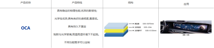 其光学OCA可用于车载显示中盖板玻璃粘接,可实现简洁高效的流程、确保高透光率、耐UV;可用于功能层战天,适用于塑料表面的无气泡粘接方案。
